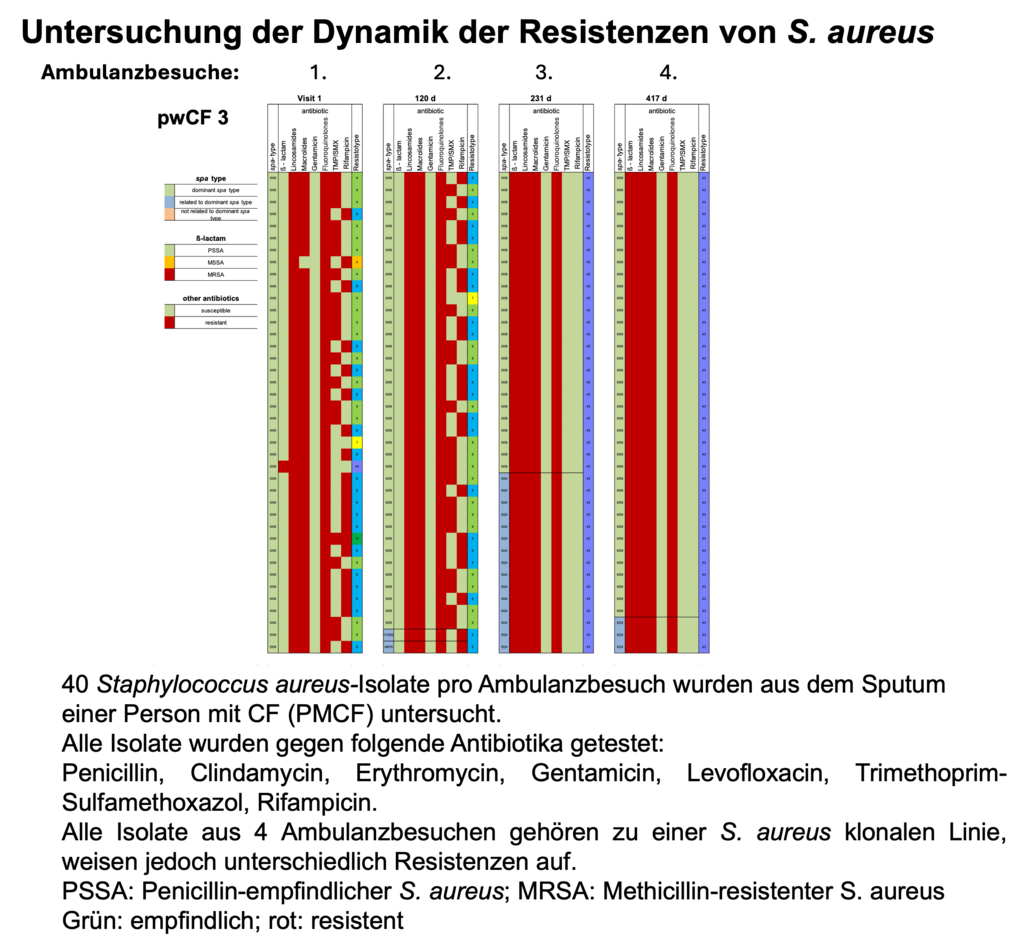 Aus eine prospektiven Studie mit 14 Individuen mit Mukoviszidose (PmCF) stehen aus 58 Ambulanzbesuchen aus den Sputen der PmCF mehr als 2000 S. aureus Isolate zur Verfügung. Aus jedem Sputum wurden 40 Isolate kultiviert und bereits sehr gut charakterisiert, siehe Wieneke et al, 2021. Die Resistenztestung ergibt sehr interessante Verläufe, die individuell sind. Für die abschließenden Untersuchungen der Resistenzdynamik müssen noch weitere 200 Isolate mit der Ganzgenomsequenzierung untersucht werden.