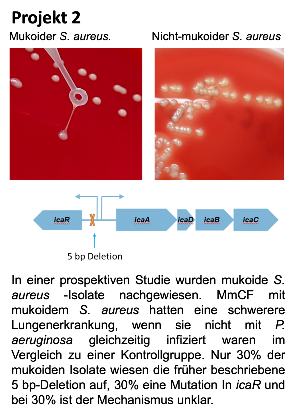 Wir haben gerade eine Studie zum Häufigkeit der mukoiden S. aureus Isolate bei PmCF abgeschlossen (multizentrisch und prospektiv, in die wir 628 PmCF aus 12 Zentren in Deutschland und 1 Zentrum in Österreich eingeschlossen haben). Das Manuskript ist bei einer internationalen Zeitschrift eingereicht und wir hoffen, dass die Studie dann bald veröffentlicht wird.